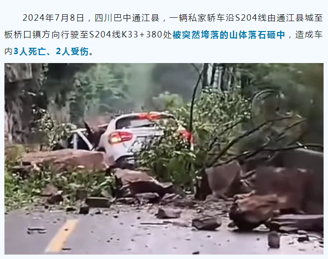 2024年7月8日,四川巴中通江縣,一輛私家轎車(chē)沿S204線由通江縣城至板橋口鎮(zhèn)方向行駛至S204線K33+380處被突然垮落的山體落石砸中,造成車(chē)內(nèi)3人死亡、2人受傷。