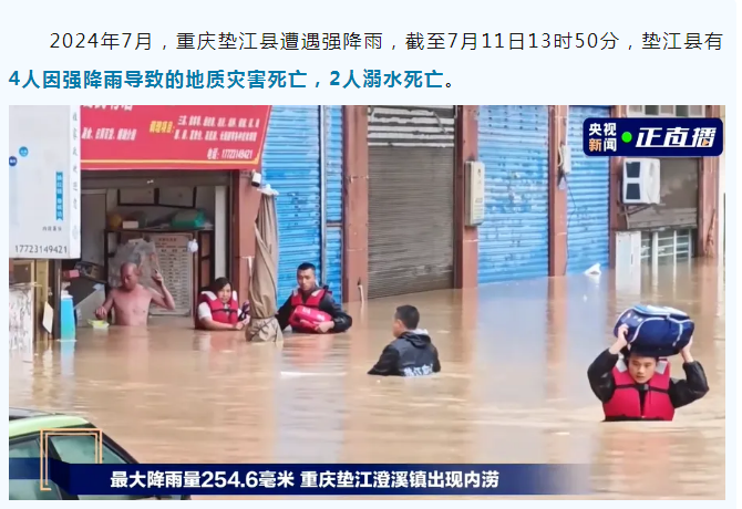 2024年7月,重慶墊江縣遭遇強(qiáng)降雨,截至7月11日13時(shí)50分,墊江縣有4人因強(qiáng)降雨導(dǎo)致的地質(zhì)災(zāi)害死亡,2人溺水死亡。