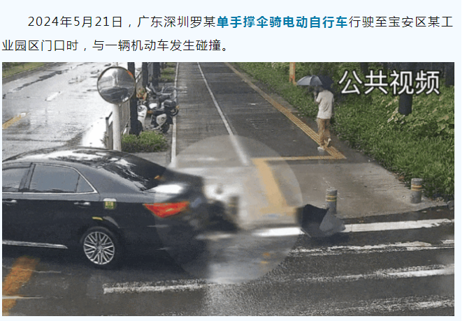 2024年5月21日,廣東深圳羅某單手撐傘騎電動(dòng)自行車(chē)行駛至寶安區(qū)某工業(yè)園區(qū)門(mén)口時(shí),與一輛機(jī)動(dòng)車(chē)發(fā)生碰撞。