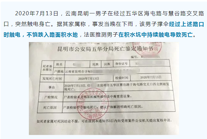 2020年7月13日,云南昆明一男子在經(jīng)過(guò)五華區(qū)海屯路與慧谷路交叉路口,突然觸電身亡。據(jù)其家屬稱,事發(fā)當(dāng)晚在下雨,該男子撐傘經(jīng)過(guò)上述路口時(shí)觸電,不慎跌入路面積水地,法醫(yī)推測(cè)男子在積水坑中持續(xù)觸電導(dǎo)致死亡。