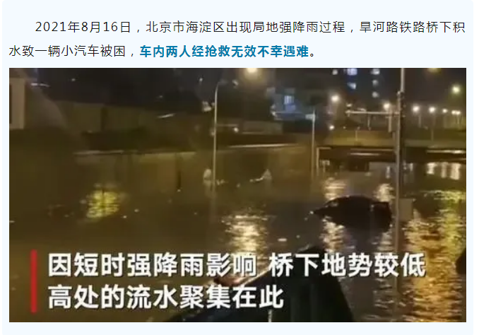 2021年8月16日,北京市海淀區(qū)出現(xiàn)局地強(qiáng)降雨過(guò)程,旱河路鐵路橋下積水致一輛小汽車(chē)被困,車(chē)內(nèi)兩人經(jīng)搶救無(wú)效不幸遇難。