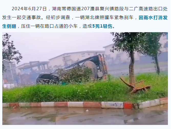 2024年6月27日,湖南常德國(guó)道207澧縣復(fù)興鎮(zhèn)路段與二廣高速路出口處發(fā)生一起交通事故。經(jīng)初步調(diào)查,一輛湖北牌照罐車(chē)緊急剎車(chē),因雨水打滑發(fā)生側(cè)翻,壓住一輛在路口占道的小車(chē),造成5死1輕傷。