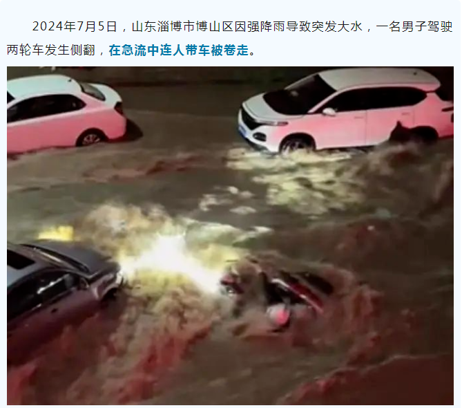 2024年7月5日,山東淄博市博山區(qū)因強(qiáng)降雨導(dǎo)致突發(fā)大水,一名男子駕駛兩輪車(chē)發(fā)生側(cè)翻,在急流中連人帶車(chē)被卷走。