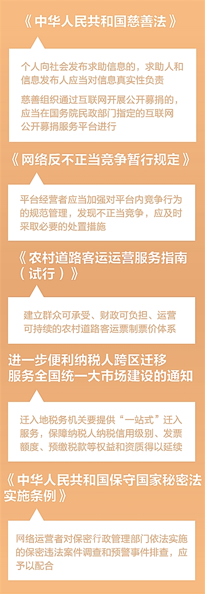 健全應(yīng)急慈善制度,規(guī)范慈善組織和個人的公開募捐行為;梳理列舉網(wǎng)絡(luò)不正當(dāng)競爭行為,督促平臺企業(yè)對平臺內(nèi)競爭行為加強(qiáng)管理;妥善安置退役軍人,維護(hù)退役軍人合法權(quán)益;規(guī)定研制生產(chǎn)單位、網(wǎng)絡(luò)運(yùn)營者等主體在保守國家秘密上的責(zé)任……9月起,修改后的《中華人民共和國慈善法》和《網(wǎng)絡(luò)反不正當(dāng)競爭暫行規(guī)定》《中華人民共和國保守國家秘密法實(shí)施條例》《退役軍人安置條例》等一批法律法規(guī)施行,回應(yīng)群眾關(guān)心關(guān)注的熱點(diǎn)問題,為經(jīng)濟(jì)社會高質(zhì)量發(fā)展提供法治保障。