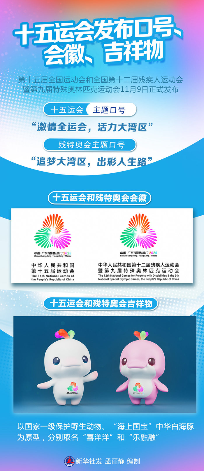 新華社廣州11月9日電(記者王浩明)第十五屆全國運(yùn)動(dòng)會(huì)和全國第十二屆殘疾人運(yùn)動(dòng)會(huì)暨第九屆特殊奧林匹克運(yùn)動(dòng)會(huì)9日正式發(fā)布主題口號(hào)、會(huì)徽、吉祥物。十五運(yùn)會(huì)主題口號(hào)為“激情全運(yùn)會(huì),活力大灣區(qū)”,殘?zhí)貖W會(huì)主題口號(hào)為“追夢大灣區(qū),出彩人生路”。