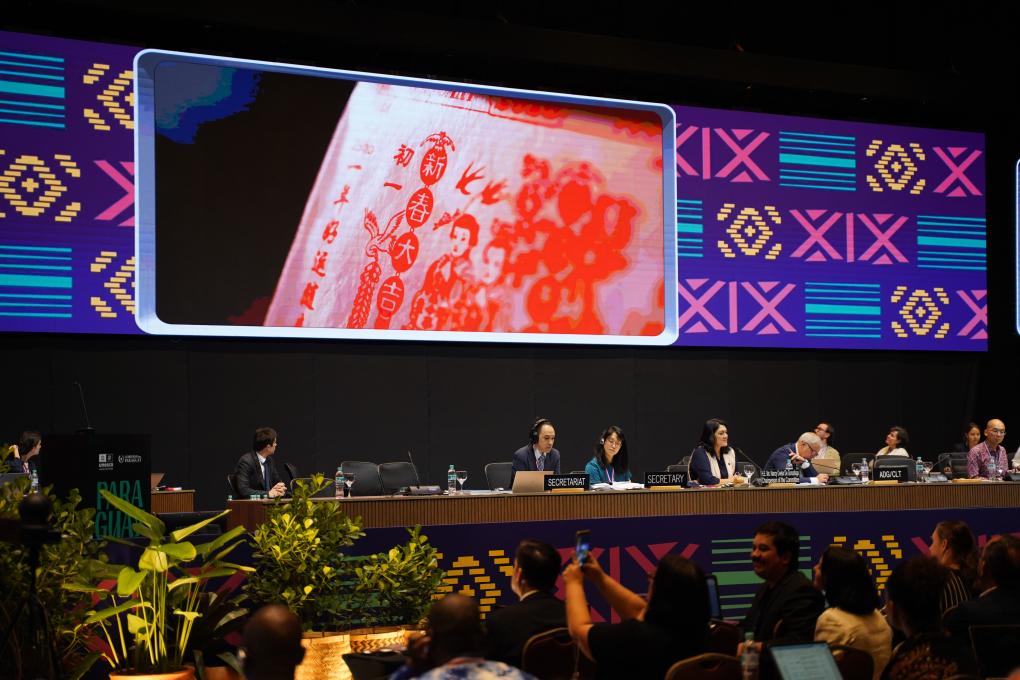 12月4日,在巴拉圭亞松森聯(lián)合國教科文組織保護非物質(zhì)文化遺產(chǎn)政府間委員會第19屆常會評審現(xiàn)場,大屏幕播放春節(jié)宣傳視頻。新華社記者 朱雨博 攝