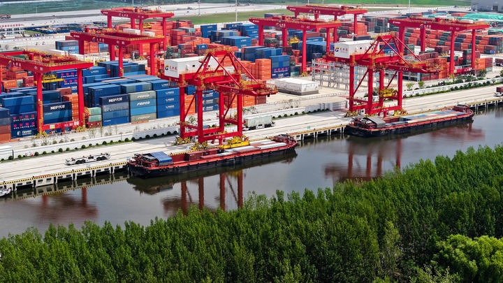 在位于京杭大運(yùn)河上的山東省濟(jì)寧港航龍拱港,貨船在裝運(yùn)集裝箱(2024年8月3日攝,無人機(jī)照片)。新華社記者 郭緒雷 攝