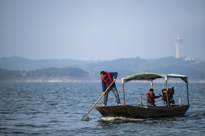 湖北丹江口市清漂隊(duì)隊(duì)長楊力(左)和清漂隊(duì)隊(duì)員在丹江口水庫進(jìn)行清漂作業(yè)(2024年10月28日攝)。新華社記者 伍志尊 攝