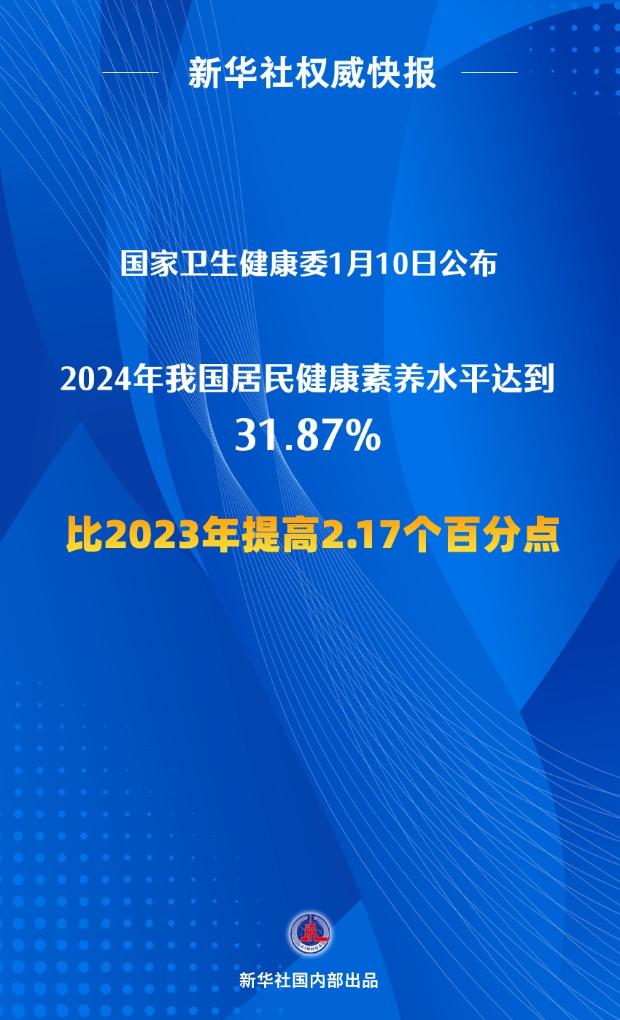記者1月10日從國家衛(wèi)生健康委了解到,2024年我國居民健康素養(yǎng)水平達(dá)到31.87%,比2023年提高2.17個(gè)百分點(diǎn)。