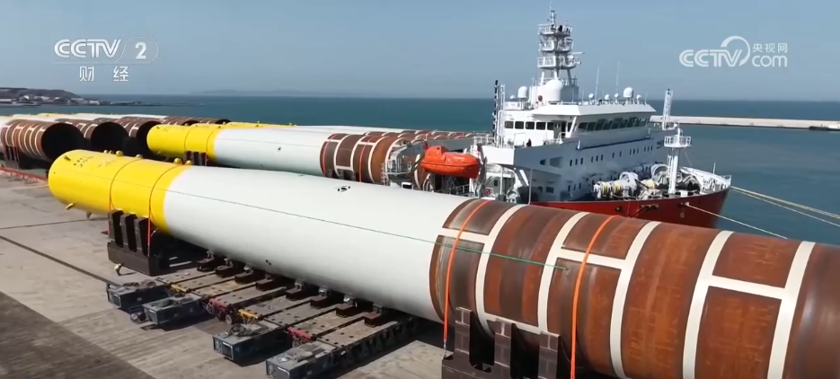 在山東蓬萊港的一處碼頭里,一根根長(zhǎng)達(dá)100多米、重約2000噸的大型海上風(fēng)電單樁正在被工作人員運(yùn)輸?shù)匠隹诖吧?。這批風(fēng)電單樁將歷經(jīng)45天的海運(yùn)抵達(dá)歐洲,用于海上風(fēng)電場(chǎng)的建造。