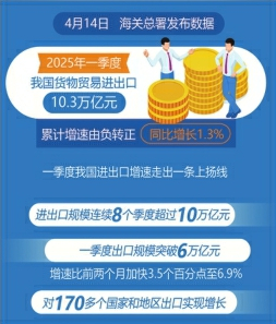 進(jìn)出口規(guī)模連續(xù)8個季度超過10萬億元;一季度出口規(guī)模突破6萬億元,增速比前兩個月加快3.5個百分點至6.9%,對170多個國家和地區(qū)出口實現(xiàn)增長……多項數(shù)據(jù)呈現(xiàn)的積極變化,成為我國外貿(mào)規(guī)模增長、質(zhì)量提升的有力見證。