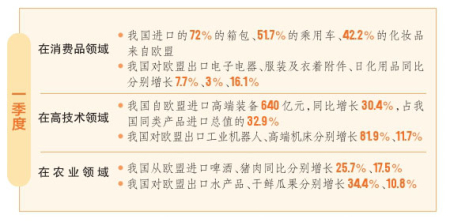 分領(lǐng)域看,在消費品領(lǐng)域,一季度,我國進口的72%的箱包、51.7%的乘用車、42.2%的化妝品來自歐盟,我國對歐盟出口電子電器、服裝及衣著附件、日化用品同比分別增長7.7%、3%、16.1%。