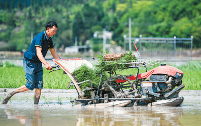 立夏過后,多地農(nóng)民搶抓農(nóng)時,陸續(xù)開展水稻插秧工作。圖為農(nóng)機手操作插秧機在貴州省黔西南布依族苗族自治州安龍縣春潭街道阿興村進行插秧作業(yè)。據(jù)了解,當?shù)亟陙硗ㄟ^建設高標準農(nóng)田,積極推廣多種農(nóng)用機械,不斷夯實糧食生產(chǎn)基礎。劉朝富攝(人民視覺)