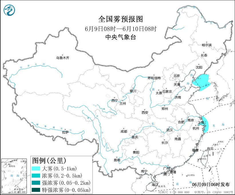 預(yù)計(jì)6月9日白天至夜間,渤海海峽、黃海北部海域、遼東半島東部沿岸海域、成山頭附近海域、長江口及杭州灣附近海域、舟山群島附近海域、大連港、上海港、寧波港將有能見度不足1公里的大霧。