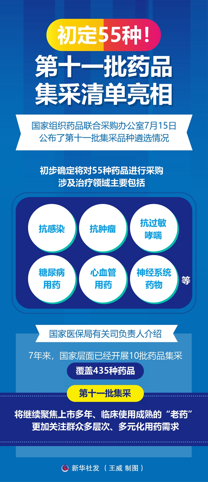 國家組織藥品聯(lián)合采購辦公室7月15日公布了第十一批集采品種遴選情況,初步確定將對55種藥品進行采購,涉及治療領域主要包括抗感染、抗腫瘤、抗過敏哮喘、糖尿病用藥、心血管用藥、神經(jīng)系統(tǒng)藥物等。