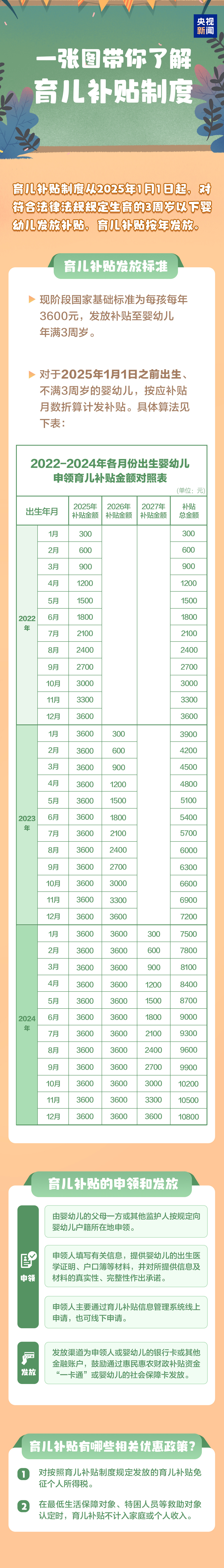 《實施方案》明確了補貼對象和標準,育兒補貼制度從2025年1月1日起,對符合法律法規(guī)規(guī)定生育的3周歲以下嬰幼兒發(fā)放補貼,育兒補貼按年發(fā)放,現(xiàn)階段國家基礎標準為每孩每年3600元,發(fā)放補貼至嬰幼兒年滿3周歲。