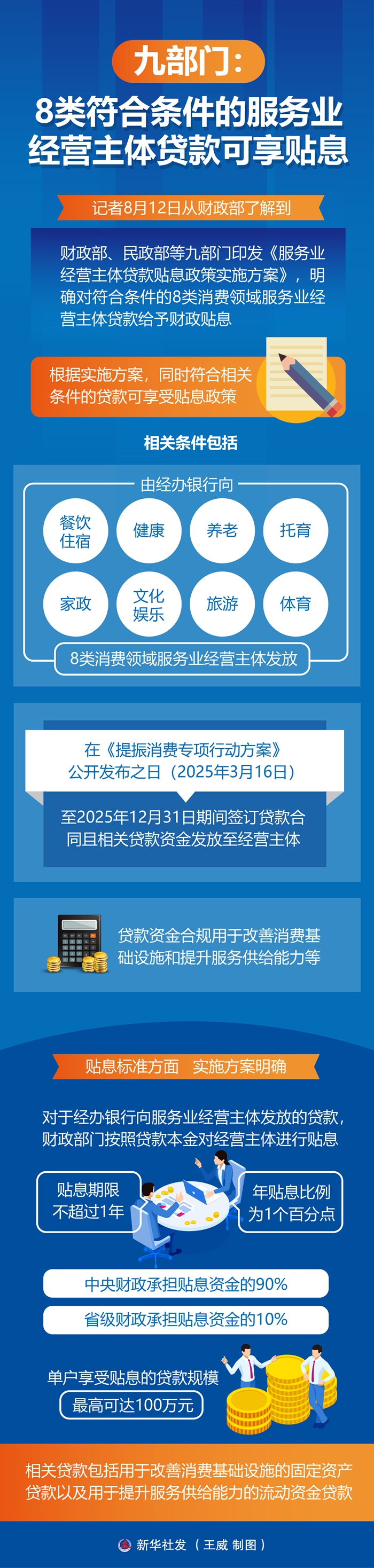新華社北京8月12日電(記者申鋮)記者12日從財(cái)政部了解到,財(cái)政部、民政部等九部門印發(fā)《服務(wù)業(yè)經(jīng)營主體貸款貼息政策實(shí)施方案》,明確對(duì)符合條件的8類消費(fèi)領(lǐng)域服務(wù)業(yè)經(jīng)營主體貸款給予財(cái)政貼息。