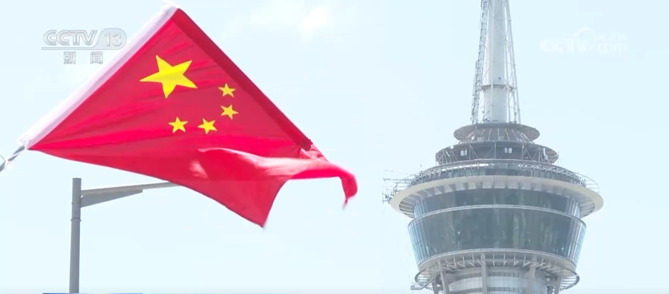 在澳門的主要街道、出入境口岸等地,鮮艷的五星紅旗迎風(fēng)飄揚,在藍天、綠樹的映襯下,構(gòu)成了一道道亮麗的風(fēng)景線,為城市增添了喜慶祥和的國慶氛圍。