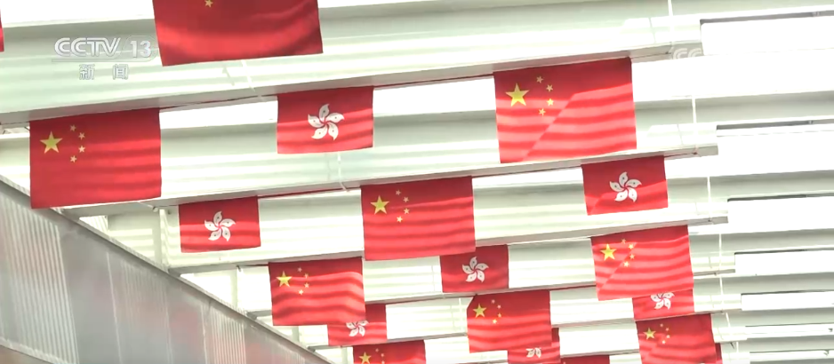 在香港的街頭巷尾,五星紅旗與紫荊花區(qū)旗迎風(fēng)飄揚,祝福標語和慶祝海報處處可見,節(jié)日氣氛濃郁。