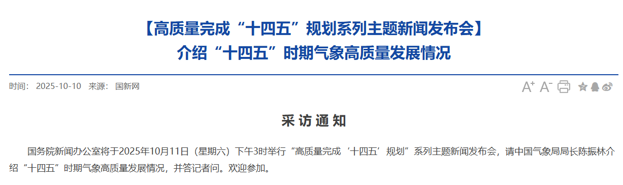 國務(wù)院新聞辦公室將于2025年10月11日(星期六)下午3時舉行“高質(zhì)量完成‘十四五’規(guī)劃”系列主題新聞發(fā)布會,請中國氣象局局長陳振林介紹“十四五”時期氣象高質(zhì)量發(fā)展情況,并答記者問。