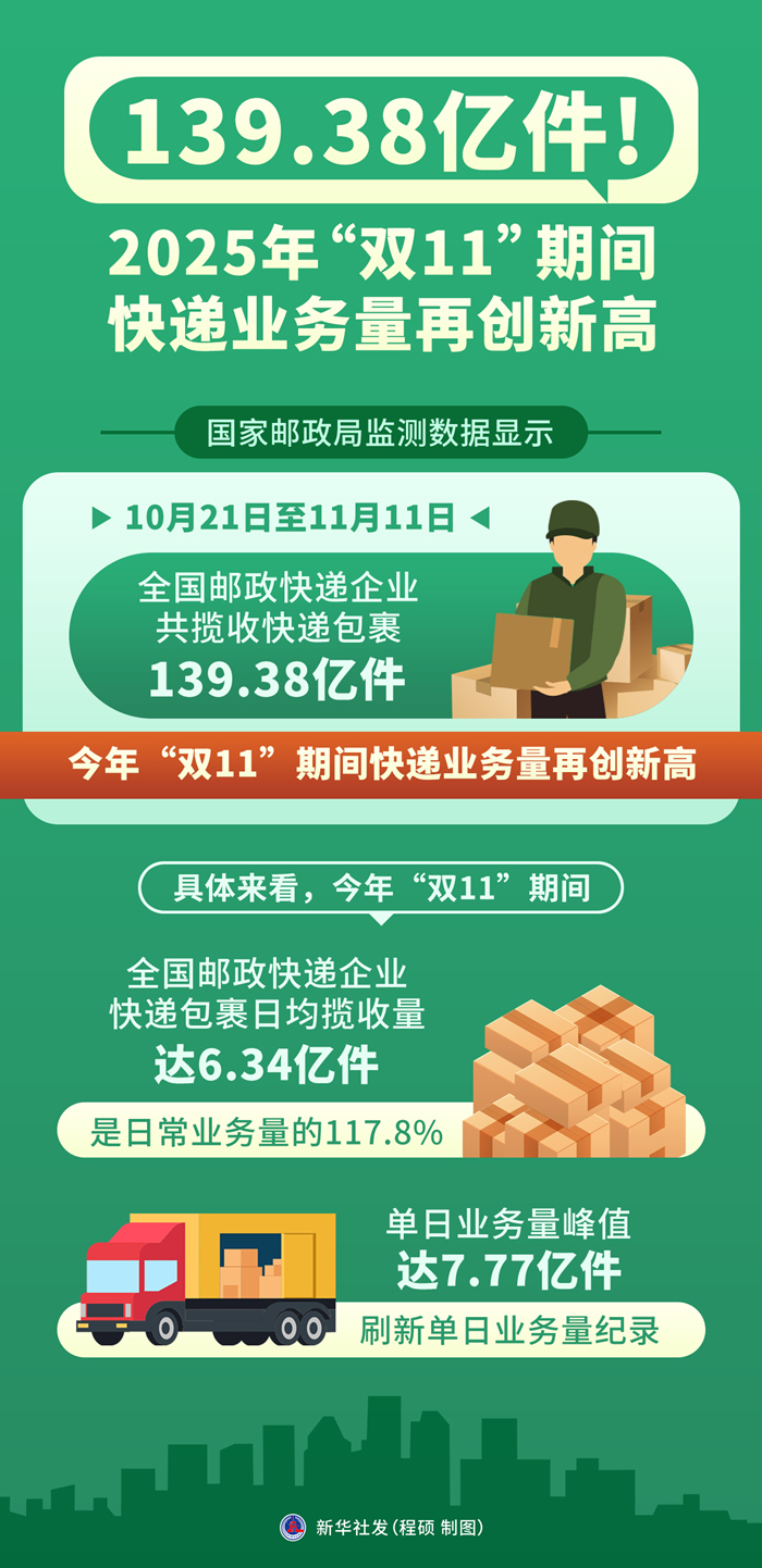 具體來看,今年“雙11”期間,全國(guó)郵政快遞企業(yè)快遞包裹日均攬收量達(dá)6.34億件,是日常業(yè)務(wù)量的117.8%;單日業(yè)務(wù)量峰值達(dá)7.77億件,刷新單日業(yè)務(wù)量紀(jì)錄。