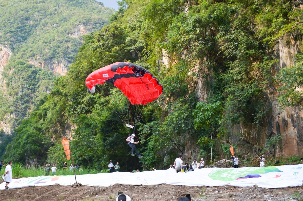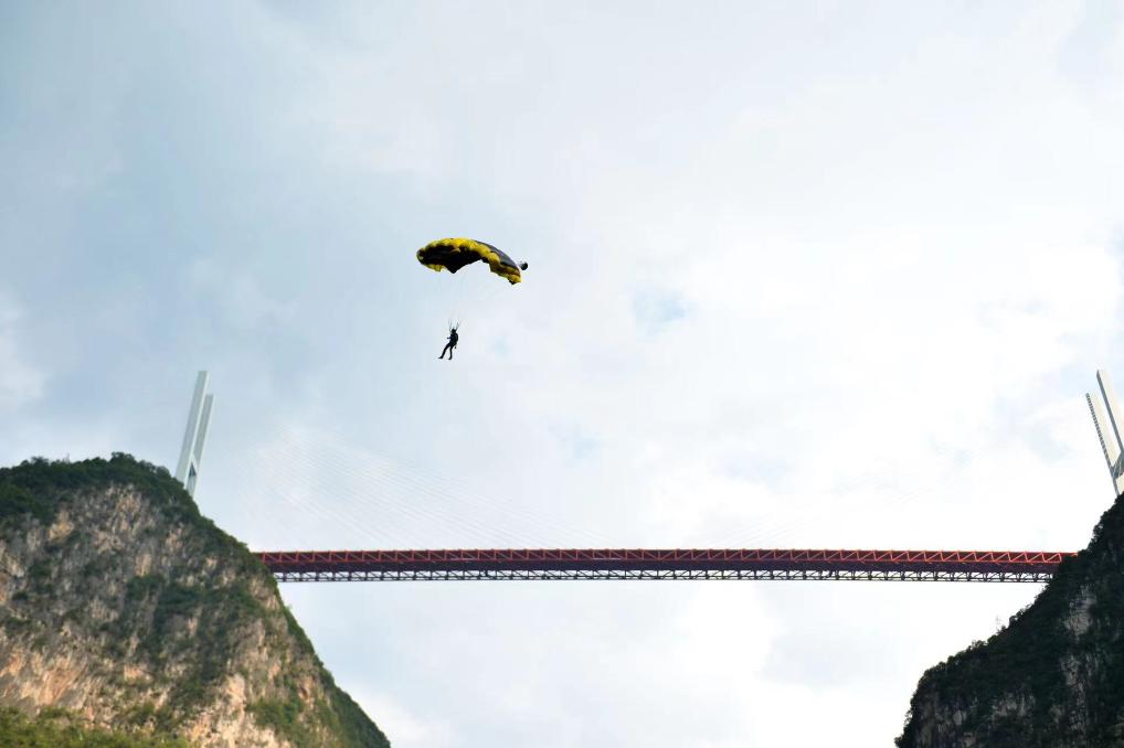 新華社貴陽9月6日電(記者駱飛、吳思)6日上午,極限運(yùn)動(dòng)員們相繼從北盤江大橋上飛躍而下,拉開了在貴州省六盤水市舉行的2023國際高橋極限運(yùn)動(dòng)邀請(qǐng)賽世界第一高橋站低空跳傘角逐的序幕。