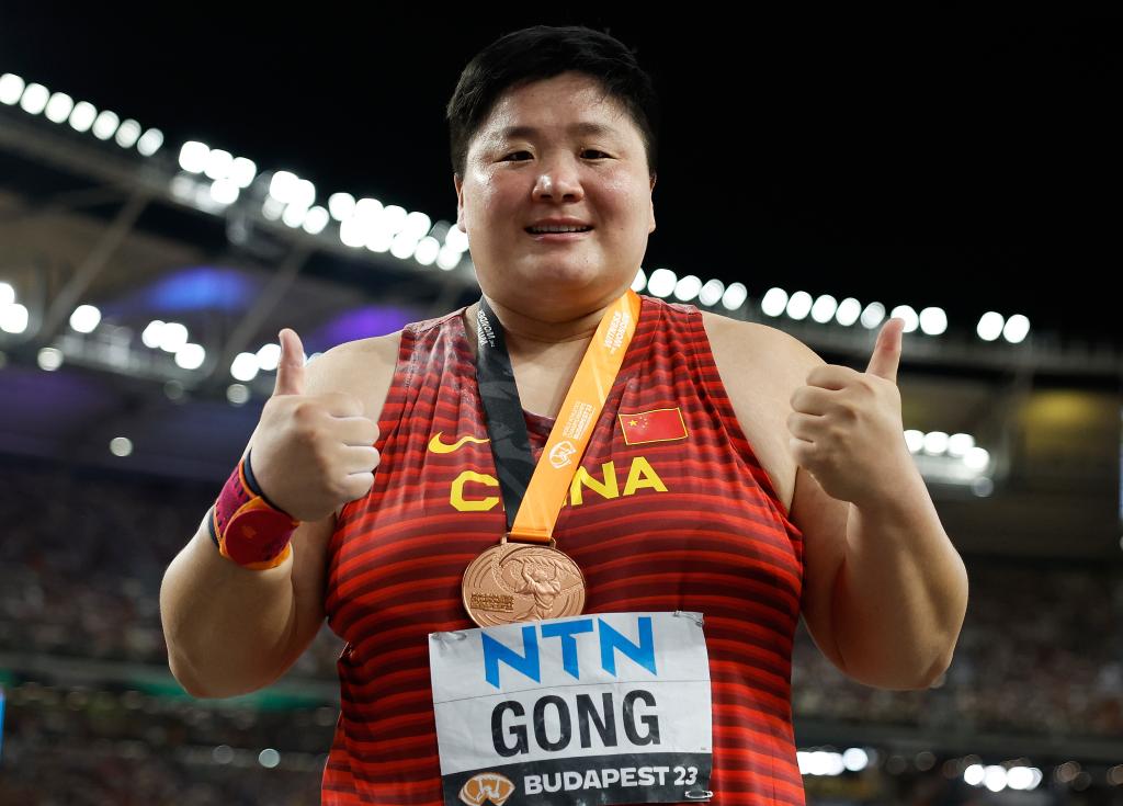 8月26日,中國選手鞏立姣在決賽后慶祝。當(dāng)日,在匈牙利布達(dá)佩斯舉行的2023世界田徑錦標(biāo)賽女子鉛球決賽中,中國選手鞏立姣以19米69的成績獲得季軍。新華社記者王麗莉攝