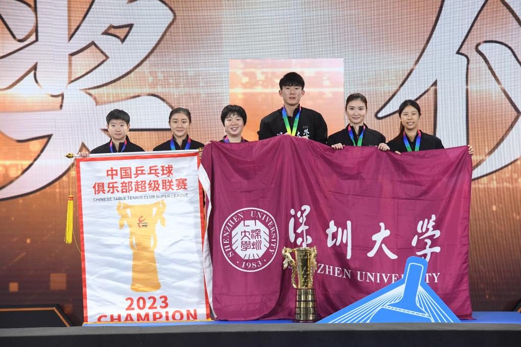女團(tuán)的冠軍爭奪更為膠著,擁有陳夢、孫穎莎兩位奧運冠軍的深圳大學(xué)隊3:2艱難戰(zhàn)勝王曼昱所在的山東魯能女隊奪冠。首盤雙打比賽,蒯曼/陳夢3:2戰(zhàn)勝范思琦/錢天一,為深圳大學(xué)隊拔得頭籌。第二盤王曼昱與孫穎莎上演“強強對話”,王曼昱3:2險勝,為山東魯能隊扳回一城。隨后陳夢3:0戰(zhàn)勝錢天一,蒯曼0:3不敵王曼昱,雙方盤分戰(zhàn)至2:2平。決勝盤中,孫穎莎3:0戰(zhàn)勝范思琦,深圳大學(xué)隊時隔三年女團(tuán)再度登頂。