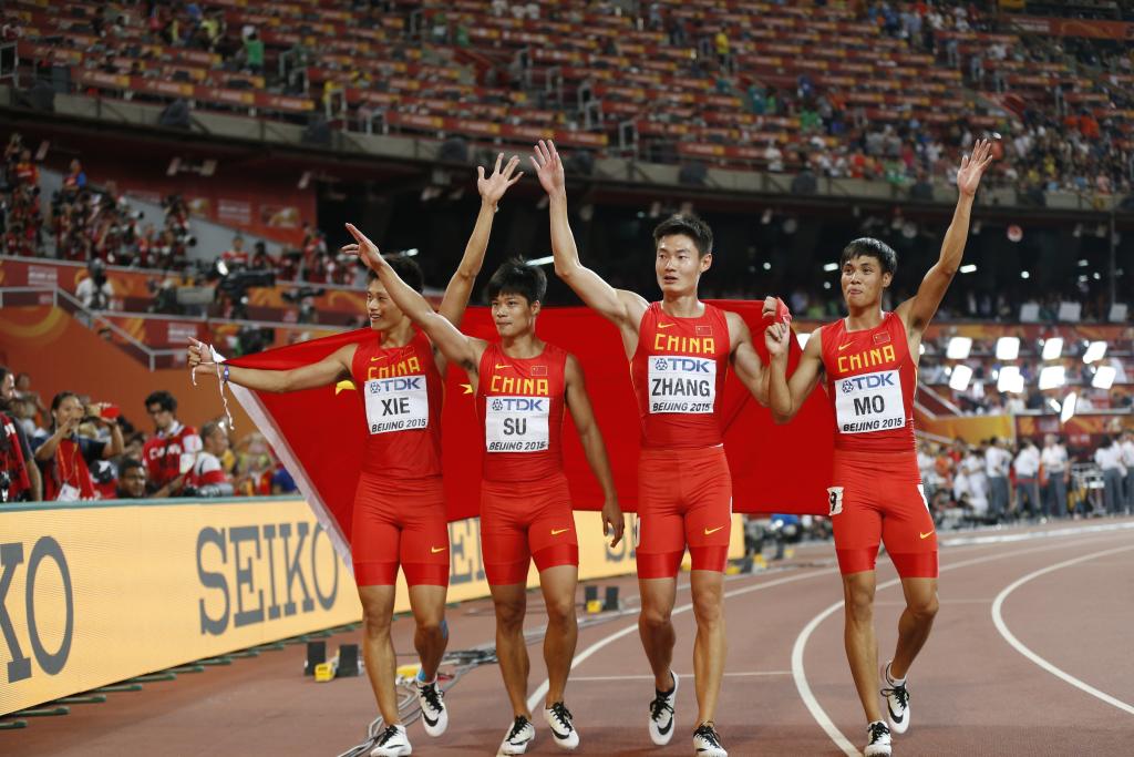 2015年8月29日,中國(guó)隊(duì)選手謝震業(yè)、蘇炳添、張培萌和莫有雪(從左至右)在2015年國(guó)際田聯(lián)世界田徑錦標(biāo)賽男子4X100米接力決賽賽后慶祝。新華社記者王麗莉攝
