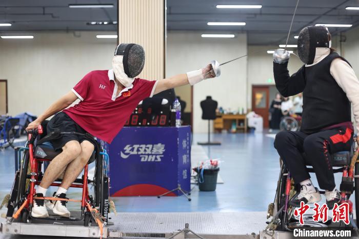 即將出征巴黎殘奧會的擊劍運(yùn)動員仲賽春(左)與隊(duì)友胡道亮練習(xí)擊劍動作。中新網(wǎng)記者泱波 攝
