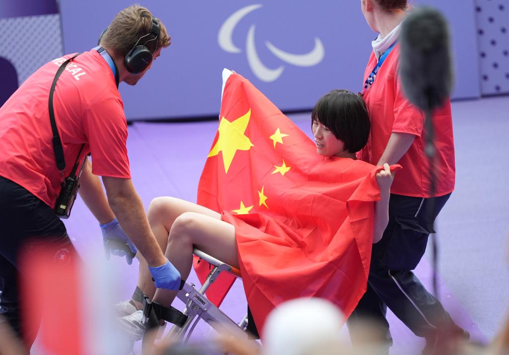 史逸婷在女子200米T36級決賽中拼到雙腿力竭,打破殘奧會紀錄奪冠。被攙上椅子后,她努力張開五星紅旗向全場展示。