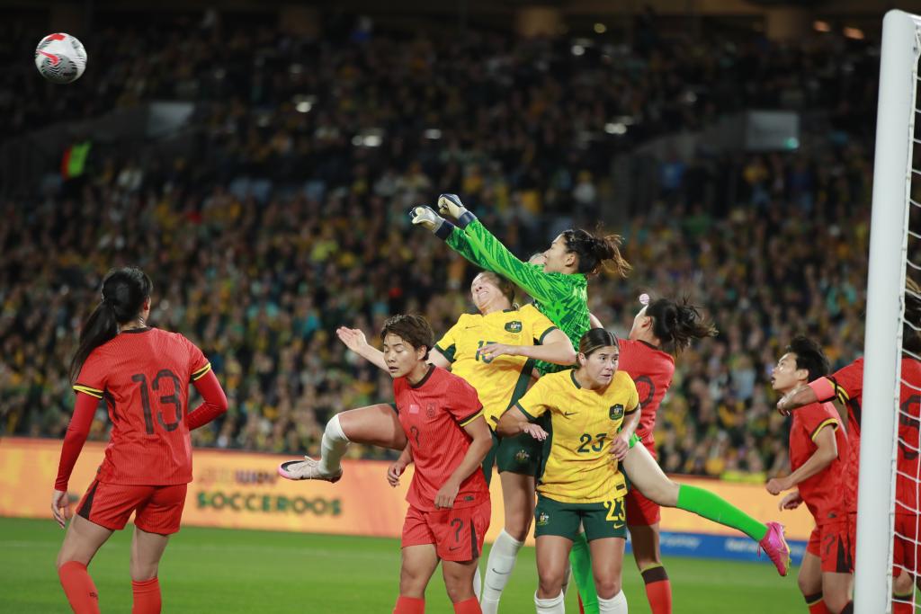 6月3日,在澳大利亞悉尼舉行的中澳女足友誼賽中,中國(guó)隊(duì)守門員徐歡(上)在比賽中撲救。新華社記者 馬平 攝