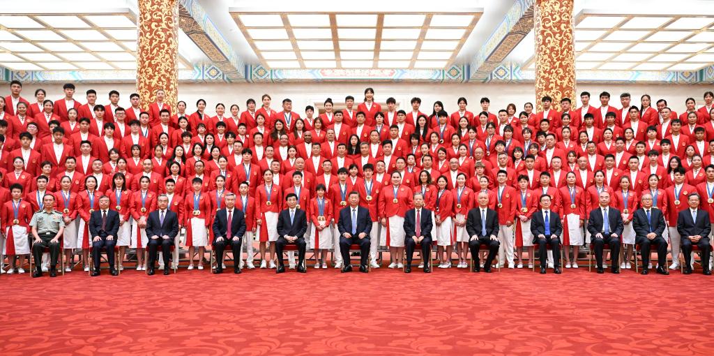 8月20日,黨和國家領導人習近平、趙樂際、王滬寧、蔡奇、李希、韓正等在人民大會堂接見第33屆夏季奧林匹克運動會中國體育代表團全體成員。新華社記者 謝環(huán)馳 攝