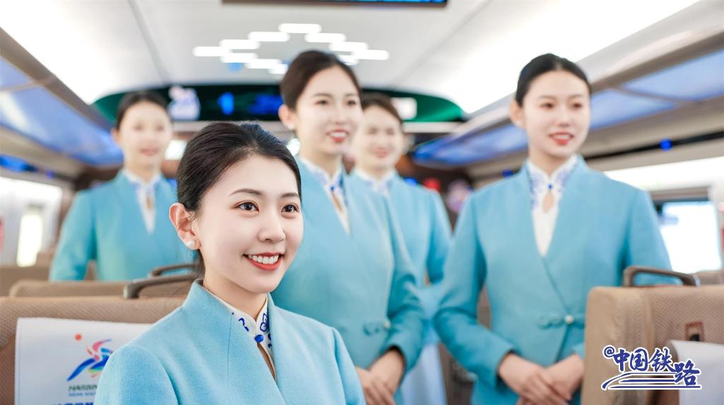 列車上,乘務(wù)員身著帶有雪花刺繡的藍(lán)白衣裙,熱情、得體地與乘客交流。車廂內(nèi)印有亞冬會元素的時(shí)刻表、貼紙隨處可見,營造出濃厚的冰雪體育盛會氛圍。
