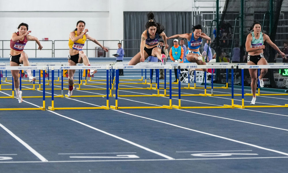 2月23日,四川隊選手吳艷妮(左三)在女子60米欄決賽中獲得冠軍。新華社記者 李博 攝