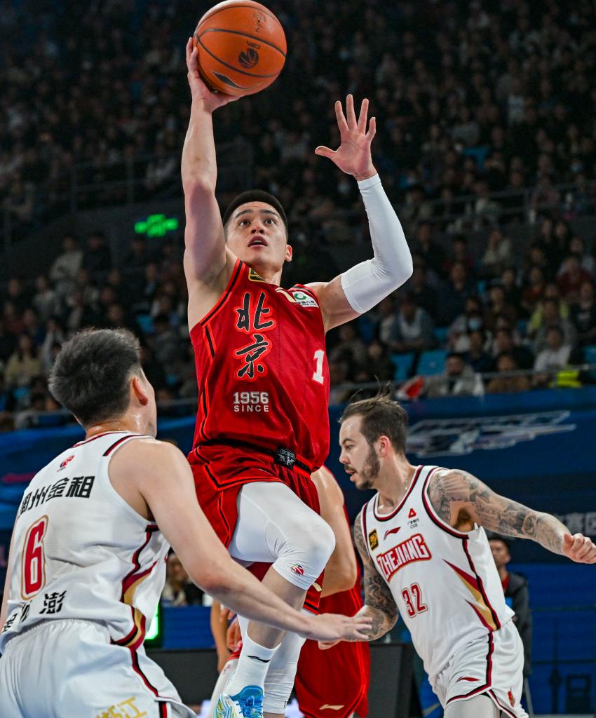 3月31日,北京隊(duì)球員曾凡博(上)在比賽中投籃。新華社記者 孫凡越 攝