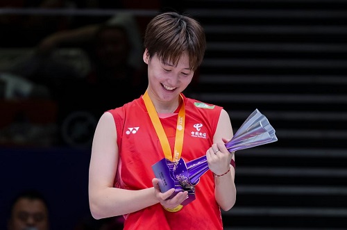 4月13日,陳雨菲在頒獎(jiǎng)儀式上手捧獎(jiǎng)杯。新華社記者 孫非 攝
