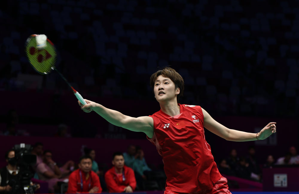 4月28日,中國(guó)隊(duì)選手陳雨菲在女單比賽中回球。最終,陳雨菲2:0戰(zhàn)勝中國(guó)香港隊(duì)選手盧善恩。新華社記者 魏培全 攝