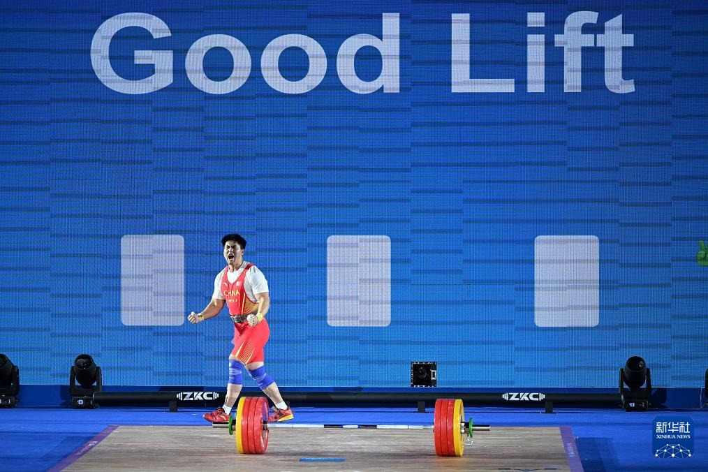 5月13日,中國(guó)選手吳艷在挺舉比賽中。最終,她獲得抓舉、挺舉、總成績(jī)?nèi)?xiàng)冠軍。新華社記者 侯昭康 攝