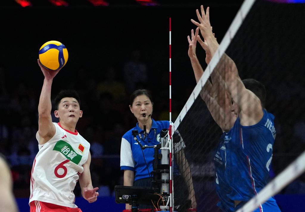 首局比賽,中國隊很快進入狀態(tài),通過進攻端的變化,有效破解了對手的網(wǎng)前防守,場面一度陷入膠著。雙方戰(zhàn)至23:23時,俞元泰扣殺得分為中國隊迎來局點,塞爾維亞隊隨后扣球出界,中國隊25:23先勝一局。