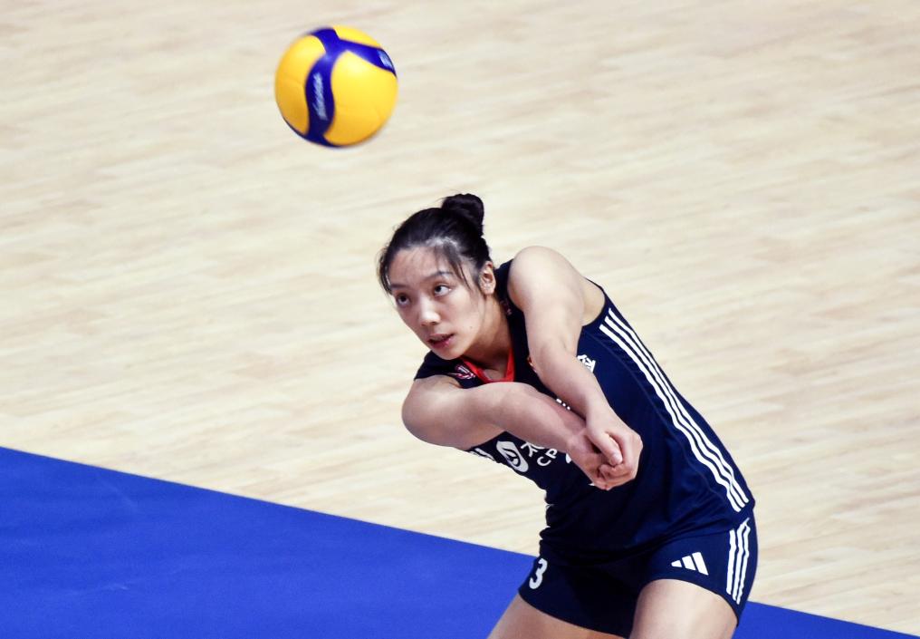 6月22日,中國(guó)隊(duì)球員唐欣在比賽中墊球。新華社發(fā)(盧炳輝攝)