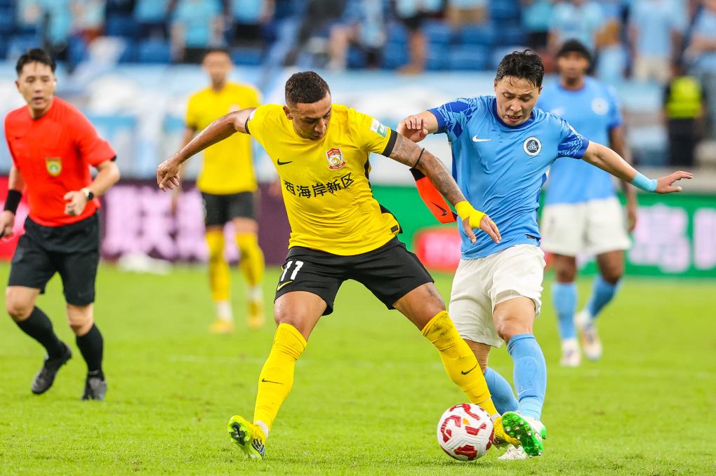 9月28日,青島西海岸隊球員戴維森(前左)在比賽中拼搶。新華社發(fā)(彭志剛攝)