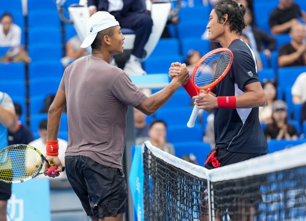 11月17日,張之臻(右)與尼敦堅(jiān)贊在賽后握手致意。新華社記者 顏麟蘊(yùn) 攝