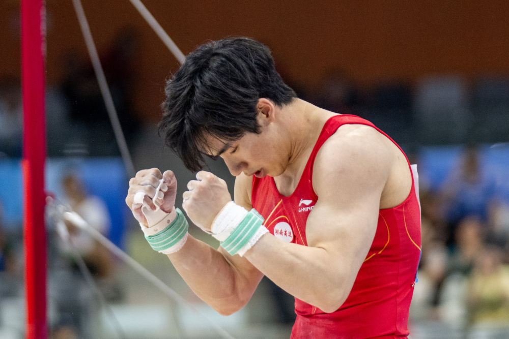 體操賽場,湖南名將張博恒在幾次沖金受挫后,以一套干凈利落的動(dòng)作問鼎男子單杠;四川隊(duì)鄒敬園則加冕男子雙杠。