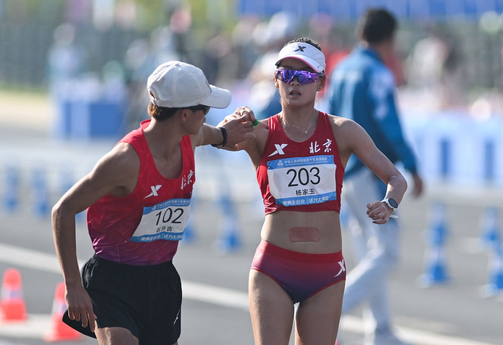 在全運(yùn)會(huì)首次設(shè)立的馬拉松競走混合接力中,18歲的石升吉與29歲老將楊家玉攜手,為北京隊(duì)贏得該項(xiàng)目歷史首金。