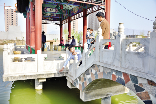 上午11點20分,韓建萍買來一袋魚食,月月趴在水榭西側(cè)靠近小石橋的欄桿上,喂水里的鴨子,韓建萍則坐在旁邊的木凳上。騎電動自行車的韓改萍碰到一個熟人,打了一聲招呼后就把電動自行車??吭陴郎?,那時她距離水榭差不多有十多米遠(yuǎn)。