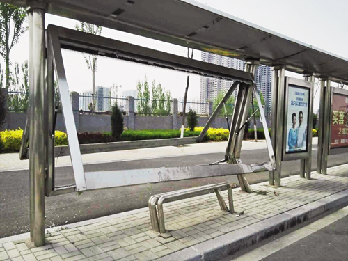 見到記者拍照,一位巡邏民警說,這個站牌是前兩天被車撞壞的,因為是新路,公交站牌還未投入使用。這條道路行人車輛稀少,肇事車輛已不知去向,也沒有目擊者。一位開車路過此處的司機說,這么漂亮的站牌,被車撞成這樣,看著讓人心疼,希望有關(guān)部門加強監(jiān)管,嚴(yán)格懲罰力度。同樣,廣大市民也應(yīng)積極行動起來,愛護公共設(shè)施,維護候車環(huán)境。圖為云中北路慘遭破壞的公交站牌(張志遠 孫明)