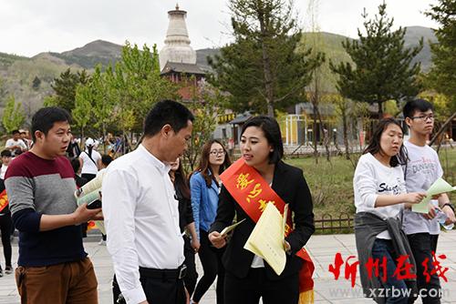 4月30日,五臺(tái)山風(fēng)景區(qū)愛(ài)心志愿者正在向游客免費(fèi)發(fā)放旅游地圖和服務(wù)指南(2)。