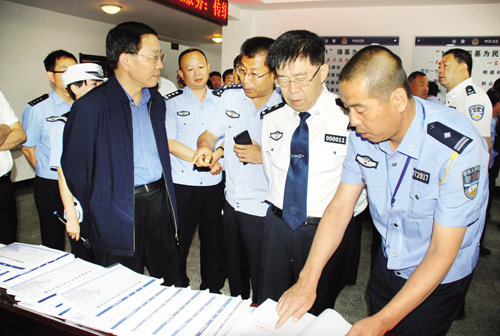 參加現(xiàn)場會的副市長武憲堂、省公安廳交管局局長賈繼武、市公安局副局長、交警支隊長袁小波等領(lǐng)導(dǎo),在偏關(guān)縣公安局交警大隊觀摩(張軍 攝)