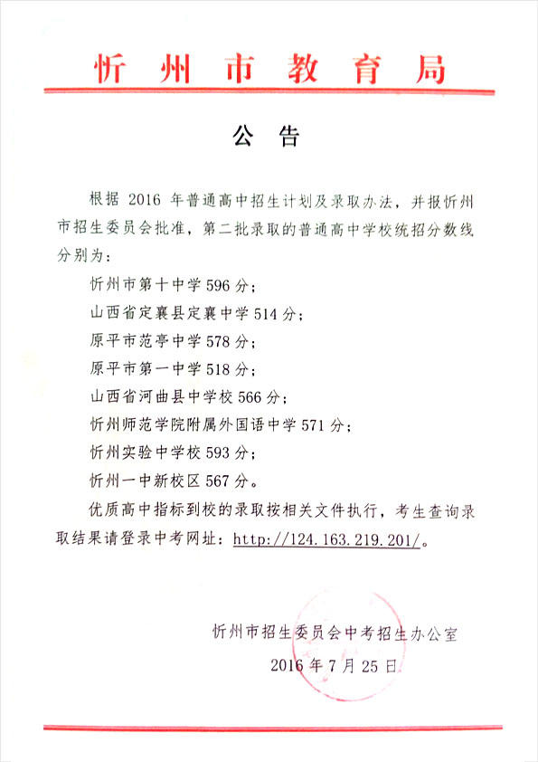 忻州市公布2016年第二批普通高中學校統(tǒng)招分數(shù)線